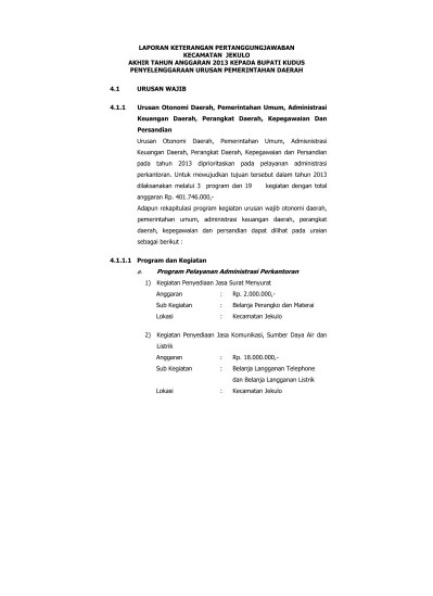 Kegiatan ini bertujuan untuk penyusunan laporan akhir tahun. Melaksanakan kegiatan pelayanan administrasi umum ;. Program pelayanan administrasi perkantoran merupakan program rutin untuk menunjang kelancaran pelaksanaan tugas kedinasan dan pelayanan . Prosentase laporan keuangan akhir tahun yang sesuai pedoman. Pelaporan kinerja dan tata cara reviu atas laporan kinerja instansi.